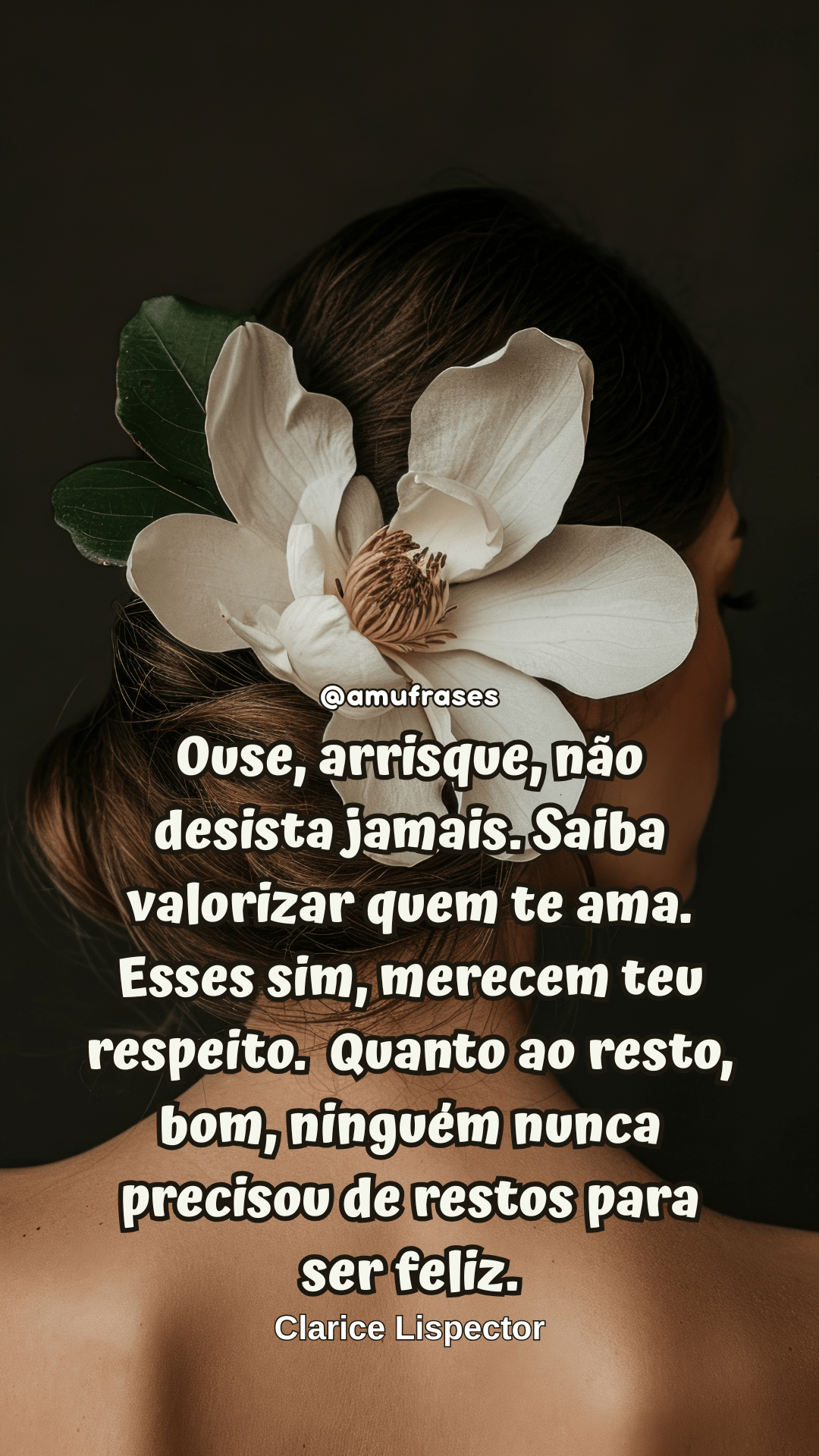 Ouse, arrisque, não desista jamais. Saiba valorizar quem te ama. Esses sim, merecem teu respeito. Quanto ao resto, bom, ninguém nunca precisou de restos para ser feliz. Clarice Lispector – @amufrases