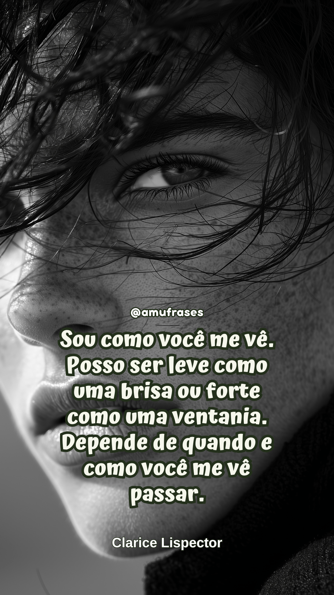 Sou como você me vê. Posso ser leve como uma brisa ou forte como uma ventania. Depende de quando e como você me vê passar. Clarice Lispector – @amufrases