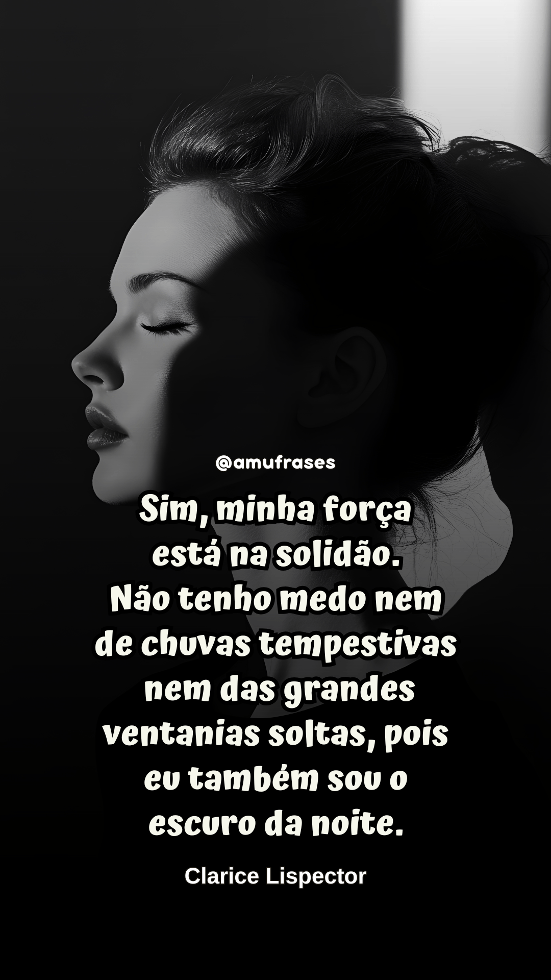 Sim, minha força está na solidão. Não tenho medo nem de chuvas tempestivas nem das grandes ventanias soltas, pois eu também sou o escuro da noite. Clarice Lispector – @amufrases