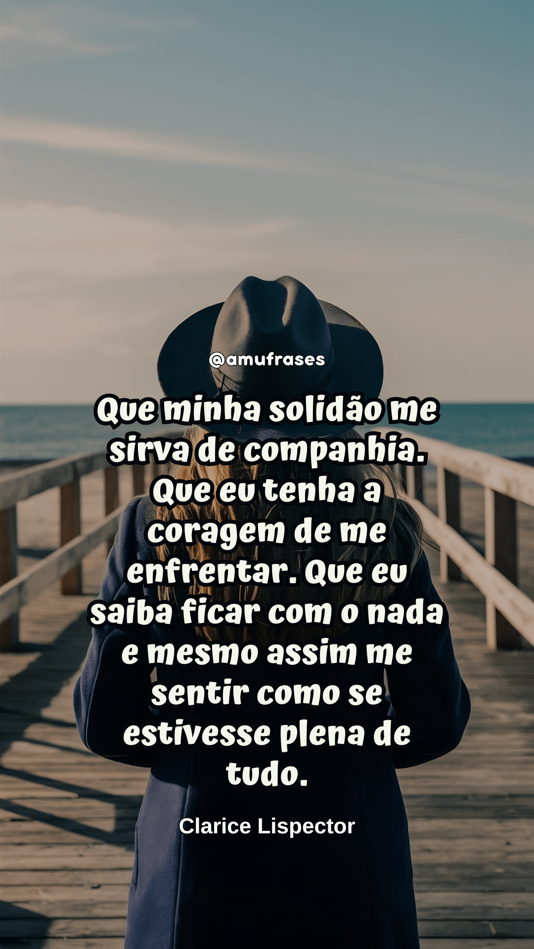 Que minha solidão me sirva de companhia. Que eu tenha a coragem de me enfrentar. Que eu saiba ficar com o nada e mesmo assim me sentir como se estivesse plena de tudo. Clarice Lispector – @amufrases