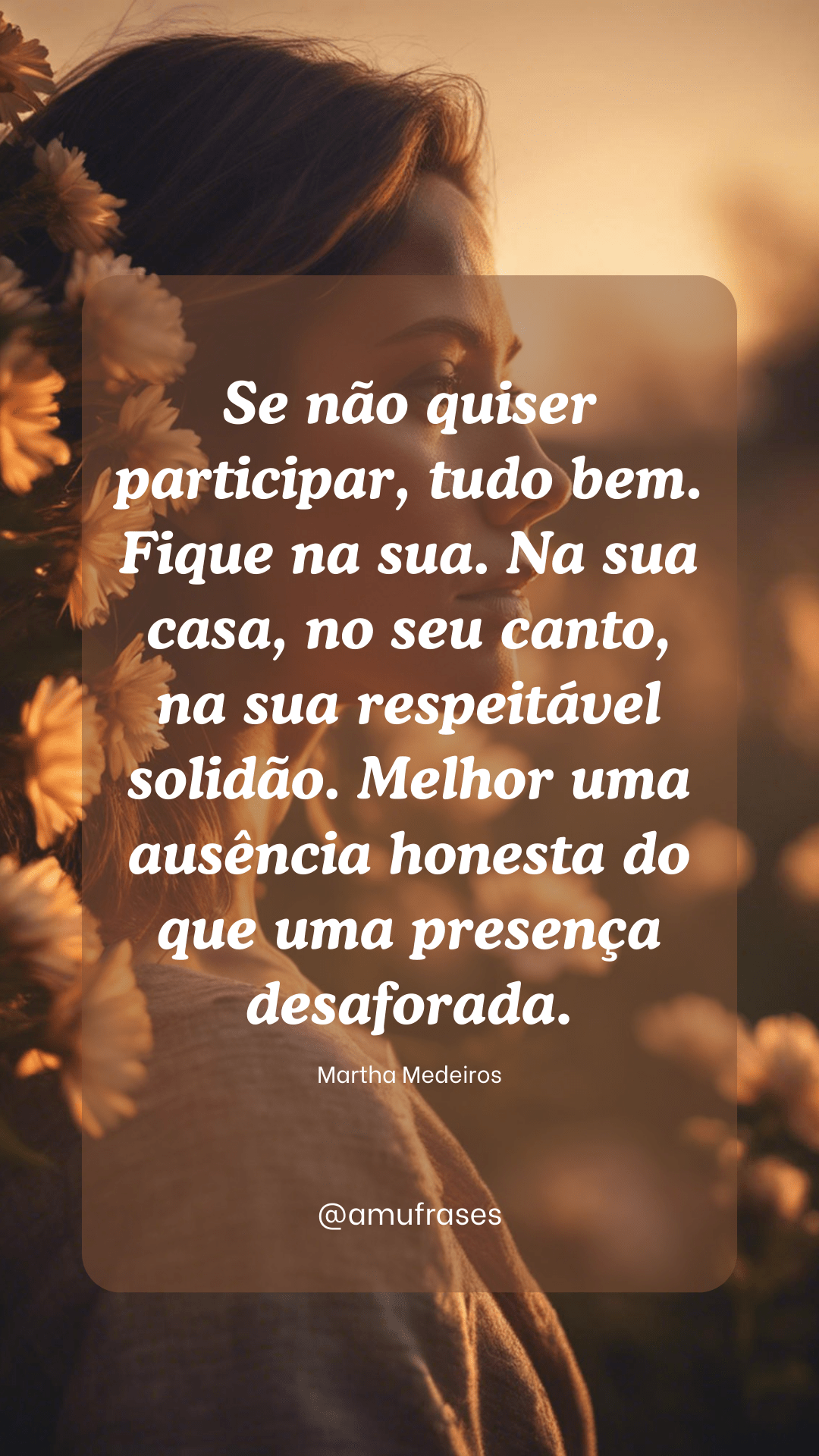 Se não quiser participar, tudo bem. Fique na sua. Na sua casa, no seu canto, na sua respeitável solidão. Melhor uma ausência honesta do que uma presença desaforada. Martha Medeiros – @amufrases