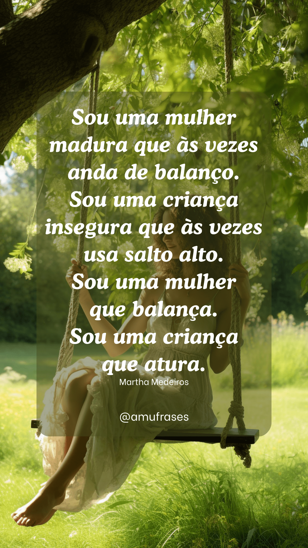Sou uma mulher madura que às vezes anda de balanço. Sou uma criança insegura que às vezes usa salto alto. Sou uma mulher que balança. Sou uma criança que atura. Martha Medeiros – @amufrases