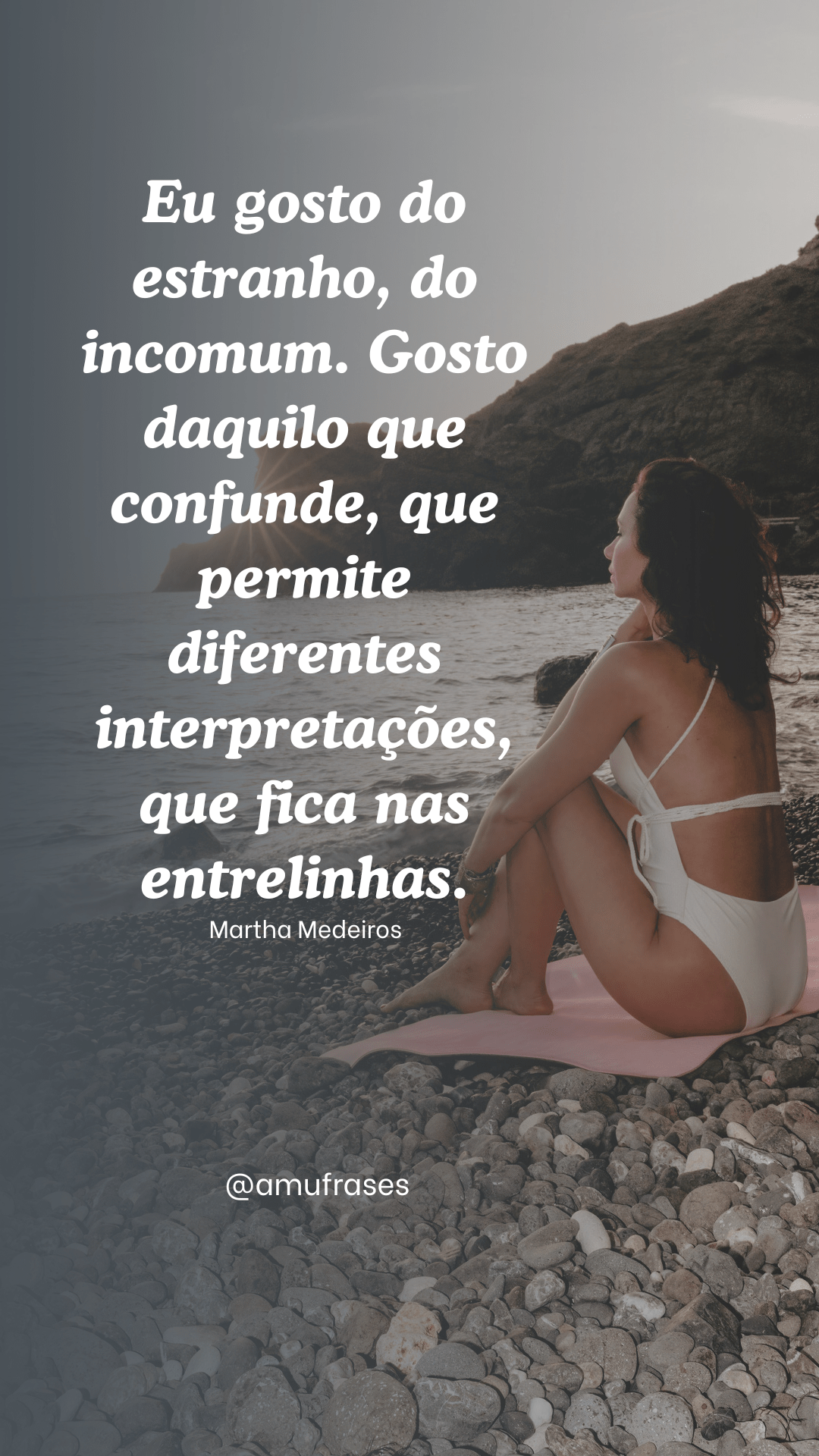 Eu gosto do estranho, do incomum. Gosto daquilo que confunde, que permite diferentes interpretações, que fica nas entrelinhas. Martha Medeiros – @amufrases