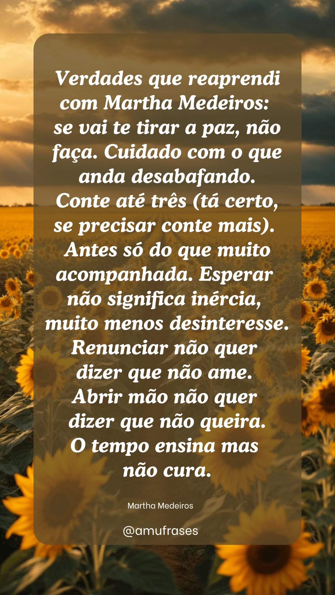 Verdades que reaprendi com Martha Medeiros: se vai te tirar a paz, não faça. Cuidado com o que anda desabafando. Conte até três (tá certo, se precisar conte mais). Antes só do que muito acompanhada. Esperar não significa inércia, muito menos desinteresse. Renunciar não quer dizer que não ame. Abrir mão não quer dizer que não queira. O tempo ensina mas não cura. Martha Medeiros – @amufrases