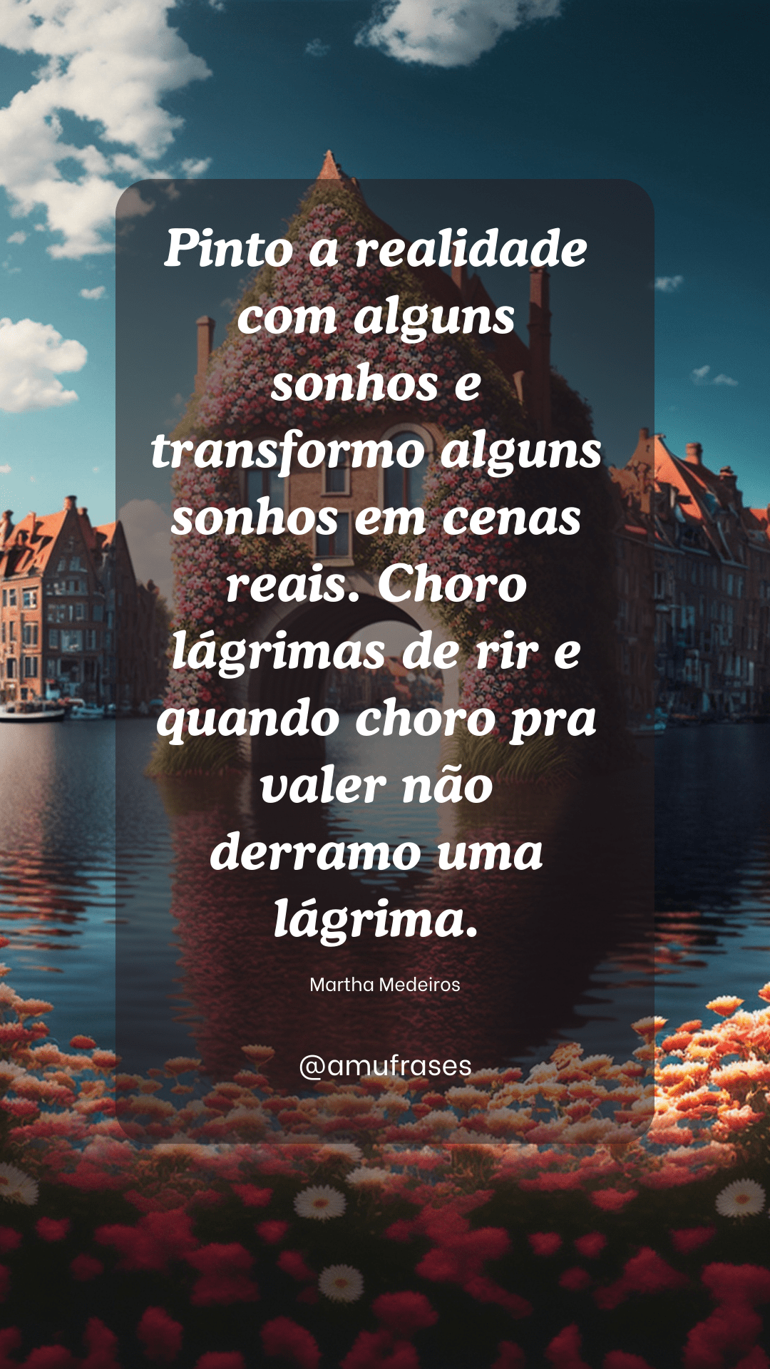 Pinto a realidade com alguns sonhos e transformo alguns sonhos em cenas reais. Choro lágrimas de rir e quando choro pra valer não derramo uma lágrima. Martha Medeiros. – @amufrases