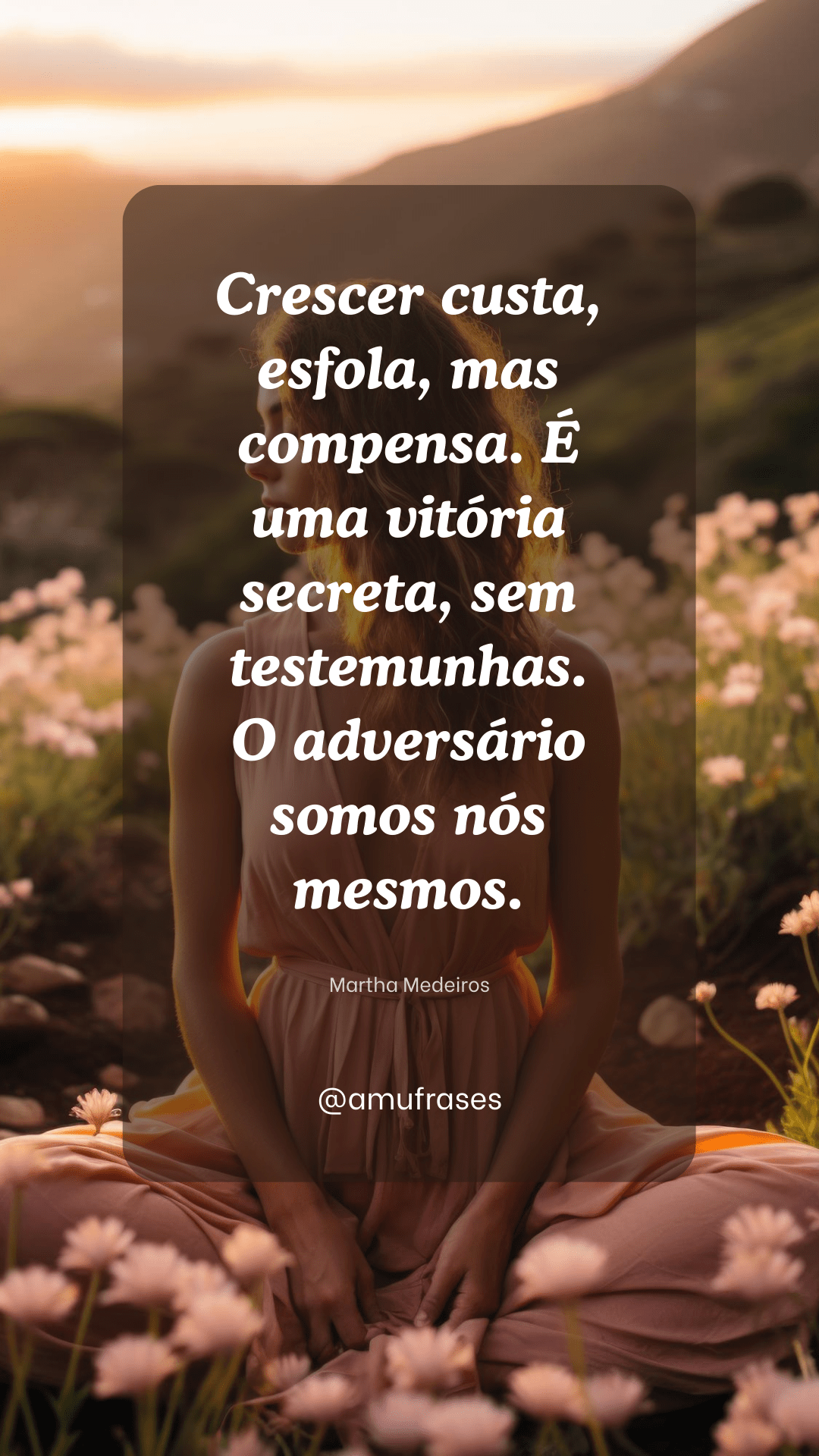 Crescer custa, esfola, mas compensa. É uma vitória secreta, sem testemunhas. O adversário somos nós mesmos. Martha Medeiros – @amufrases