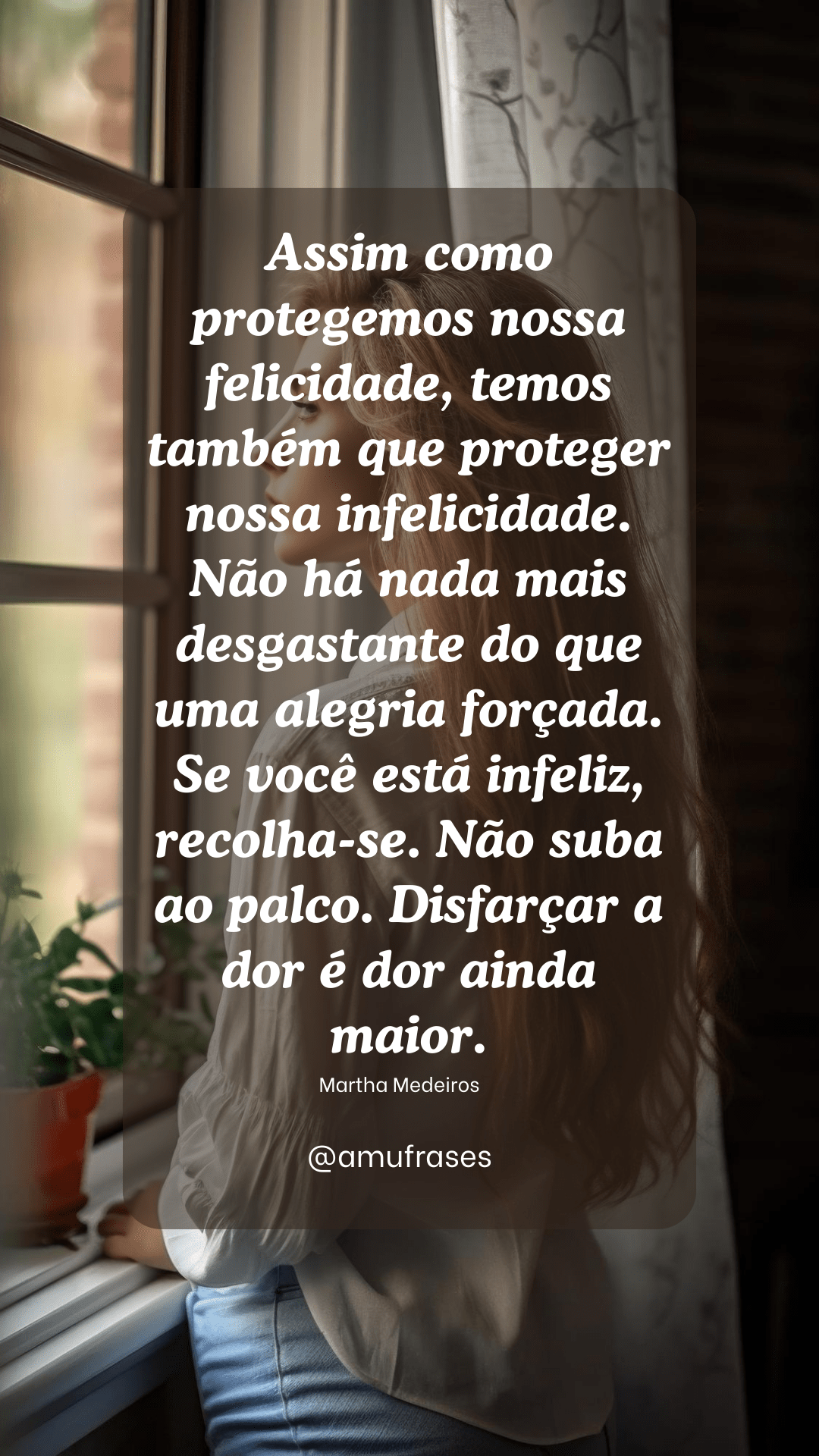 Assim como protegemos nossa felicidade, temos também que proteger nossa infelicidade. Não há nada mais desgastante do que uma alegria forçada. Se você está infeliz, recolha-se. Não suba ao palco. Disfarçar a dor é dor ainda maior. Martha Medeiros – @amufrases