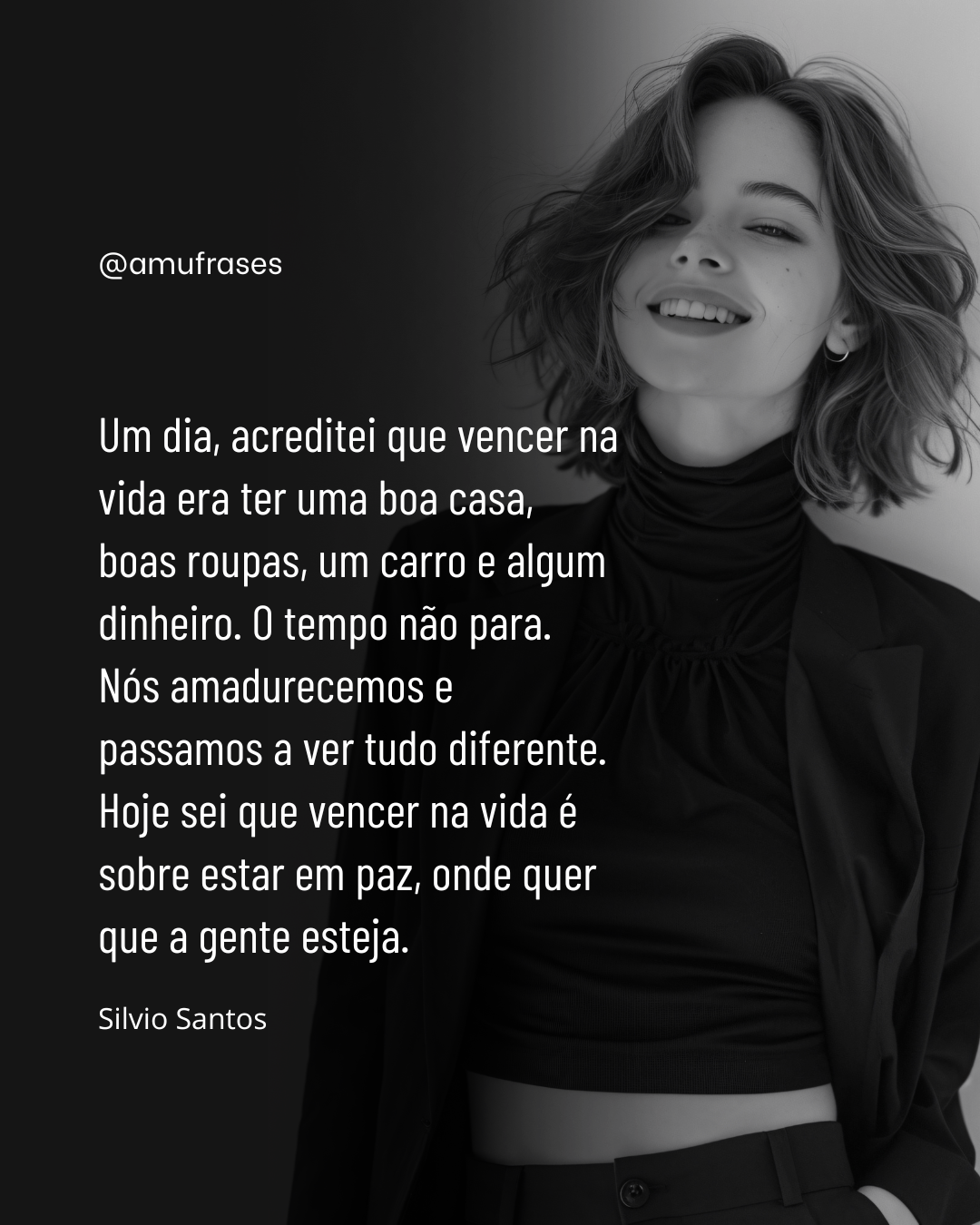 Um dia, acreditei que vencer na vida era ter uma boa casa, boas roupas, um carro e algum dinheiro. O tempo não para. Nós amadurecemos e passamos a ver tudo diferente. Hoje sei que vencer na vida é sobre estar em paz, onde quer que a gente esteja. Silvio Santos – @amufrases