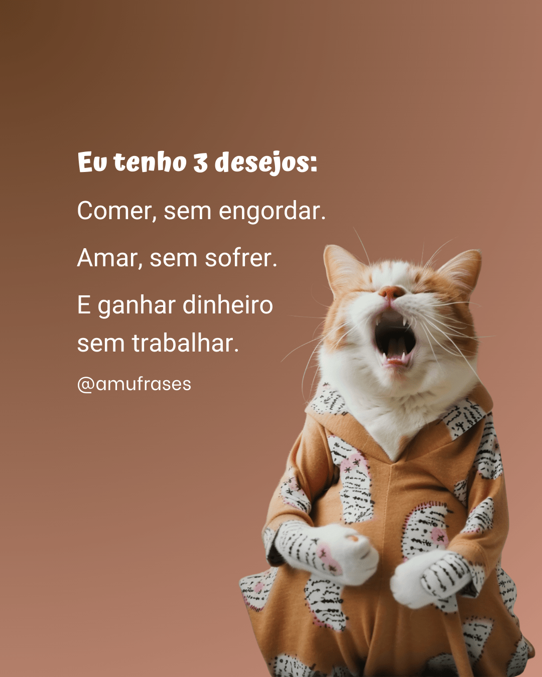 Eu tenho 3 desejos: Comer, sem engordar. Amar, sem sofrer. E ganhar dinheiro sem trabalhar. – @amufrases