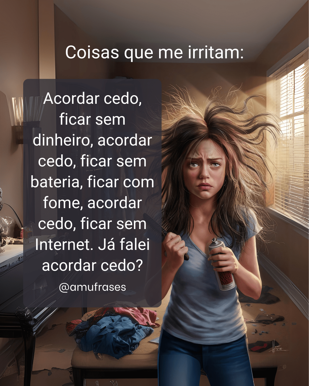 Coisas que me irritam: Acordar cedo, ficar sem dinheiro, acordar cedo, ficar sem bateria, ficar com fome, acordar cedo, ficar sem Internet. Já falei acordar cedo? @amufrases
