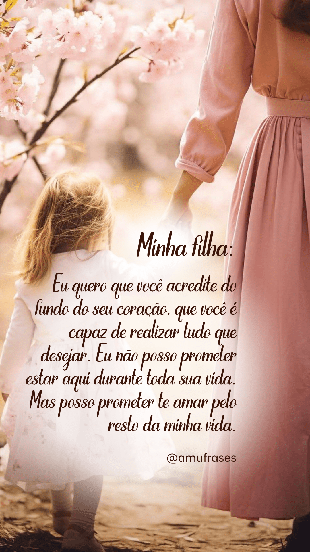 Minha filha, eu quero que você acredite do fundo do seu coração, que você é capaz de realizar tudo que desejar. Eu não posso prometer estar aqui durante toda sua vida. Mas posso prometer te amar pelo resto da minha vida. – @amufrases